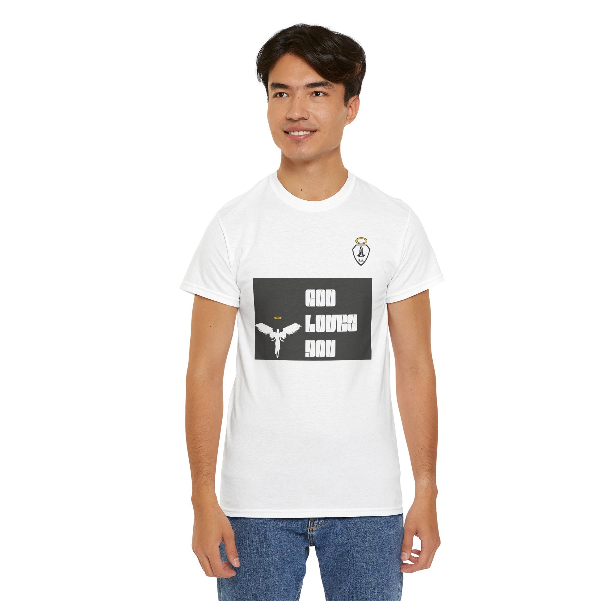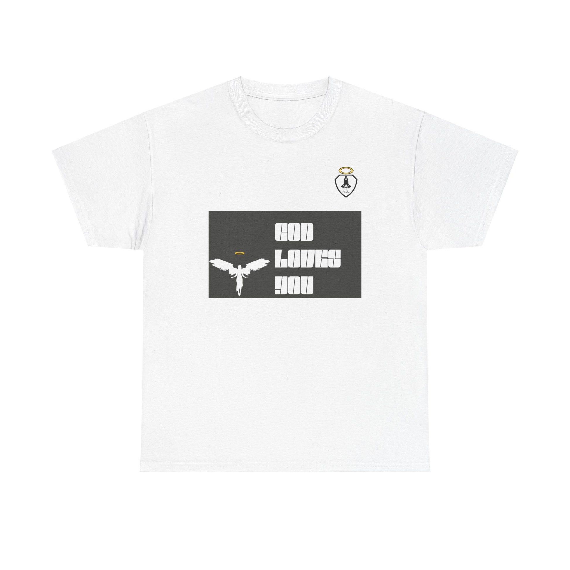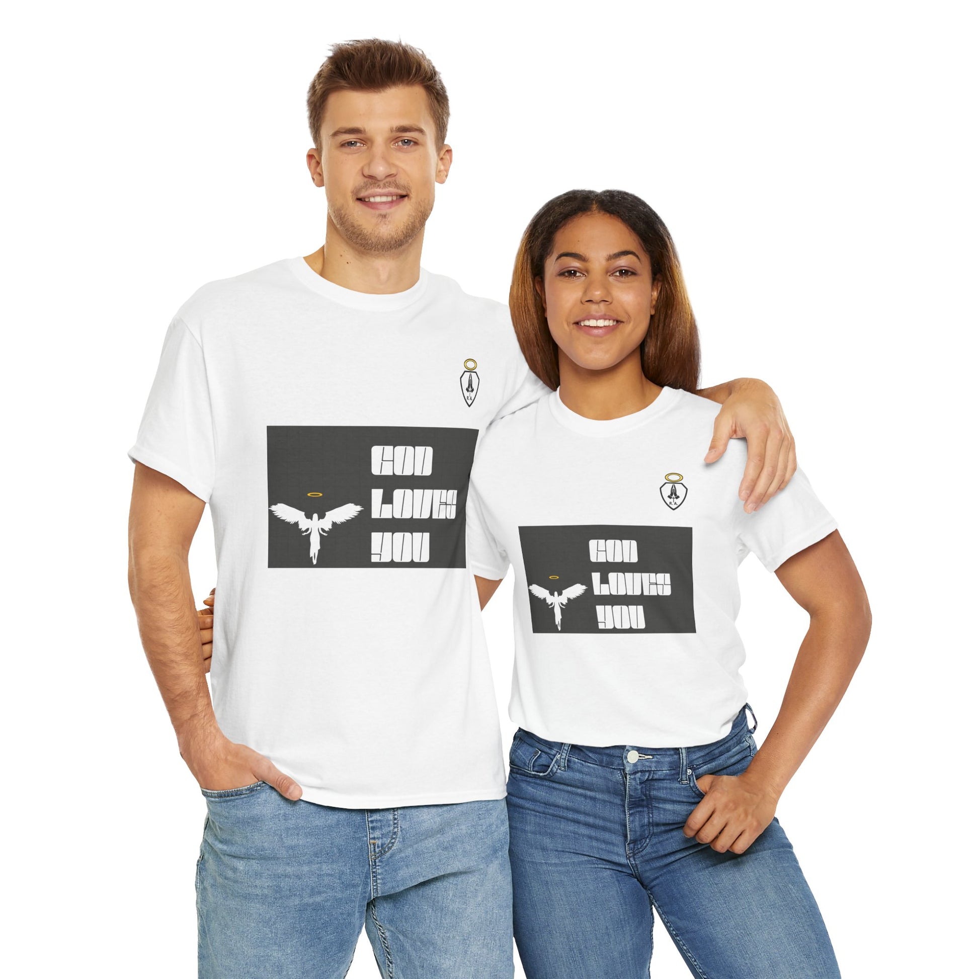 **GOD LOVES YOU** is a great way to share your Love of God and show who you belong to. Start up a conversation about Jesus or just represent your part in the family of God. This unisex heavy cotton tee is the basic staple of any wardrobe. The specially spun fibers provide a smooth texture against your skin, guaranteeing you comfort. No side seams mean there are no itchy interruptions under the arms. The shoulders have tape for improved durability.