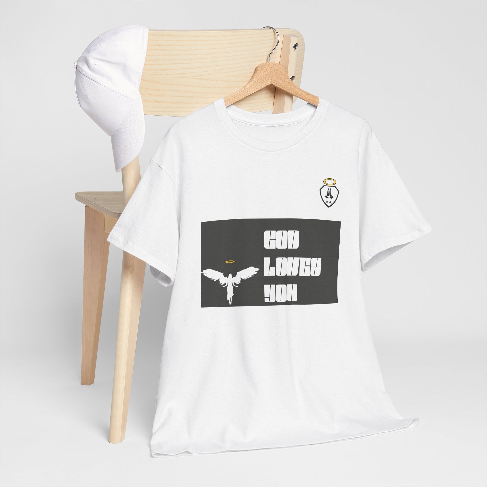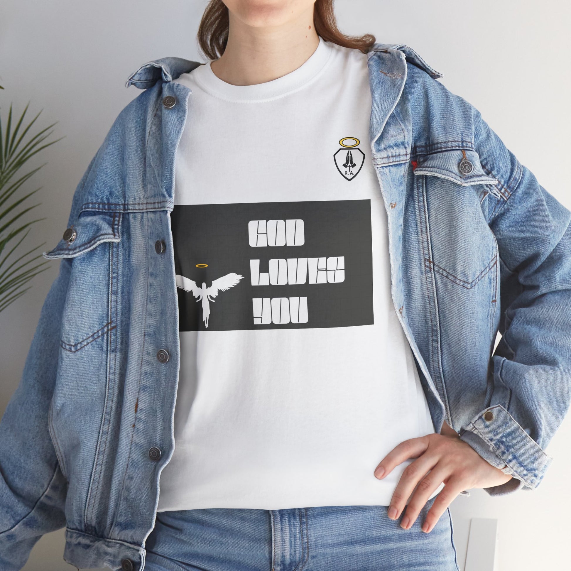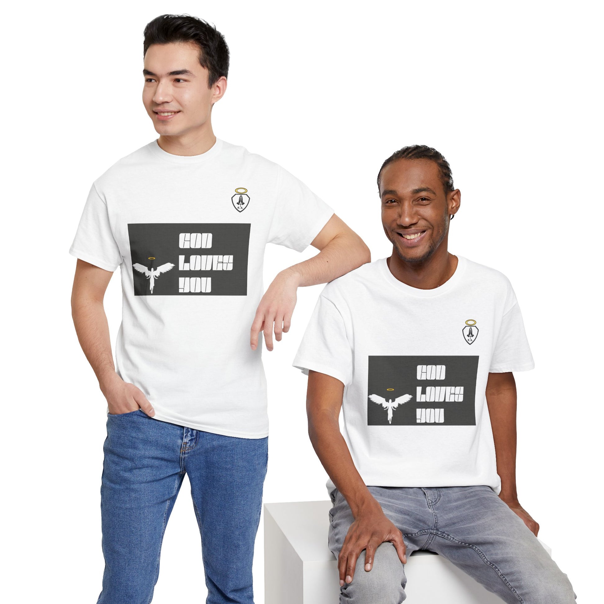 **GOD LOVES YOU** is a great way to share your Love of God and show who you belong to. Start up a conversation about Jesus or just represent your part in the family of God. This unisex heavy cotton tee is the basic staple of any wardrobe. The specially spun fibers provide a smooth texture against your skin, guaranteeing you comfort. No side seams mean there are no itchy interruptions under the arms. The shoulders have tape for improved durability.