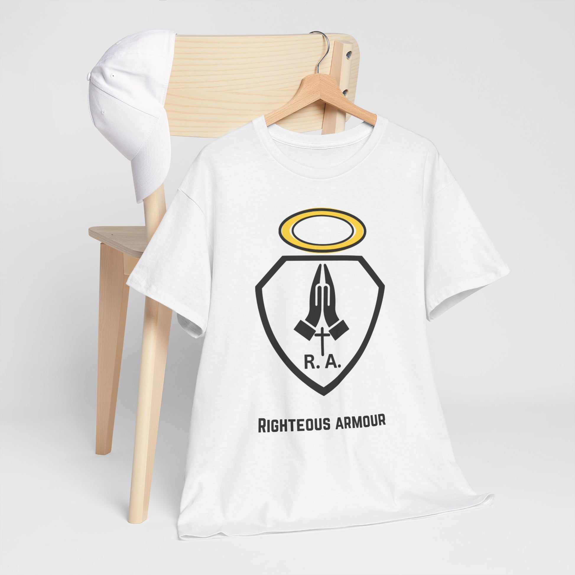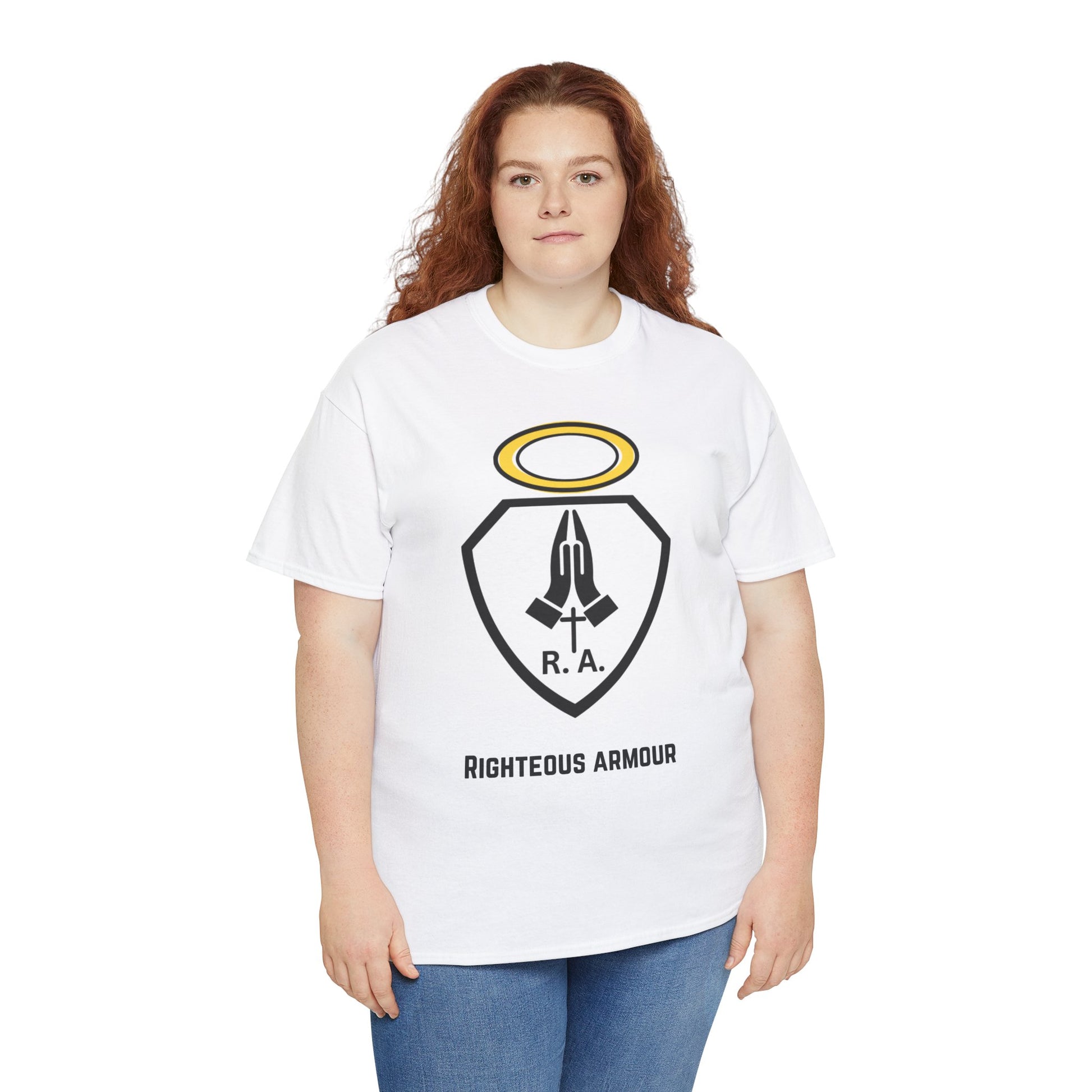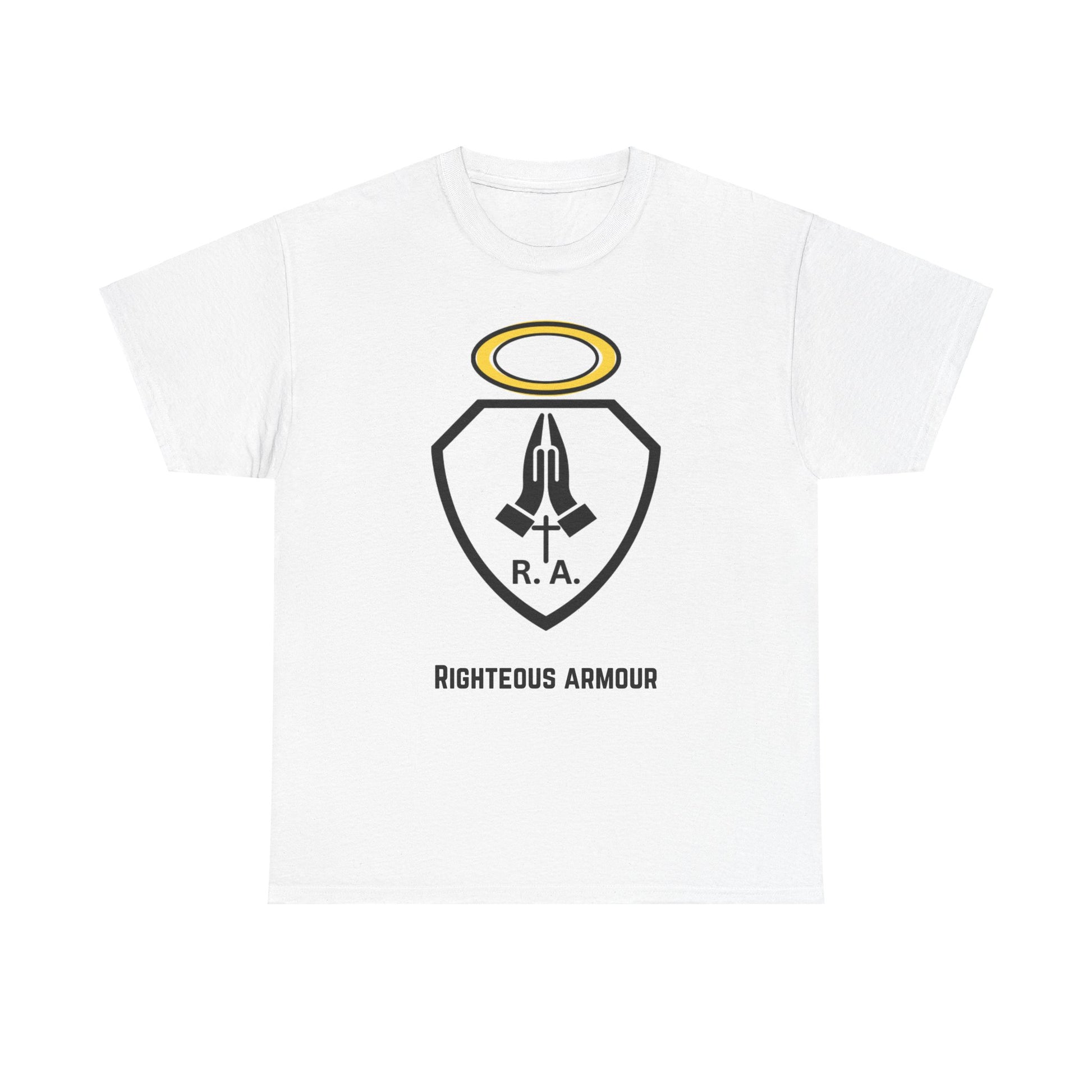 *RIGHTEOUS ARMOUR* is a great way to share your Love of God and show who you belong to. Start up a conversation about Jesus or just represent your part in the family of God. This unisex heavy cotton tee is the basic staple of any wardrobe. The specially spun fibers provide a smooth texture against your skin, guaranteeing you comfort. No side seams mean there are no itchy interruptions under the arms. The shoulders have tape for improved durability.