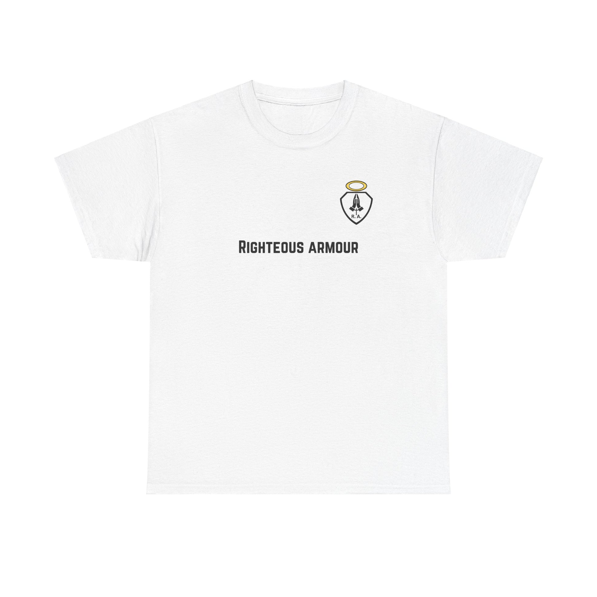 *RIGHTEOUS ARMOUR* is a great way to share your Love of God and show who you belong to. Start up a conversation about Jesus or just represent your part in the family of God. This unisex heavy cotton tee is the basic staple of any wardrobe. The specially spun fibers provide a smooth texture against your skin, guaranteeing you comfort. No side seams mean there are no itchy interruptions under the arms. The shoulders have tape for improved durability.