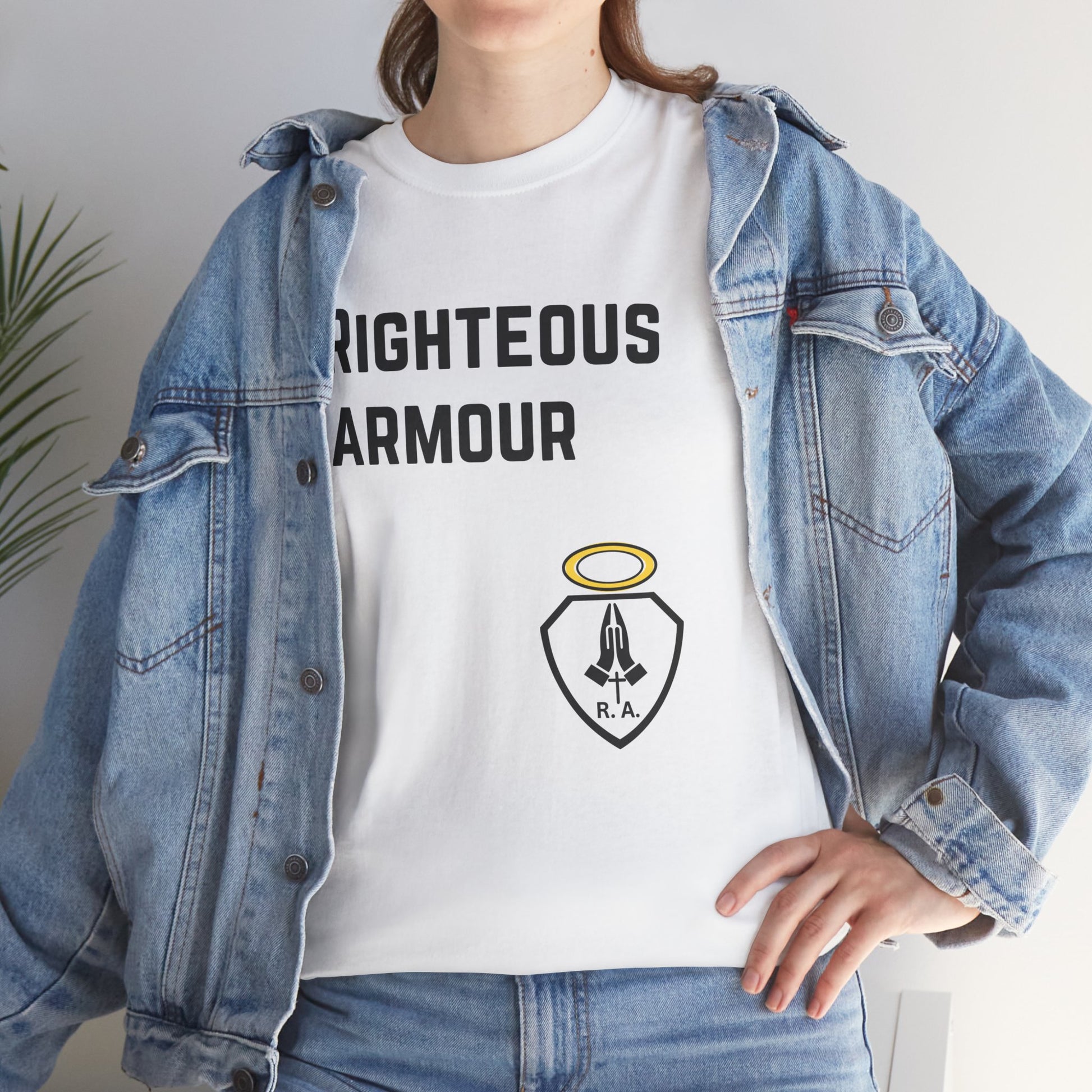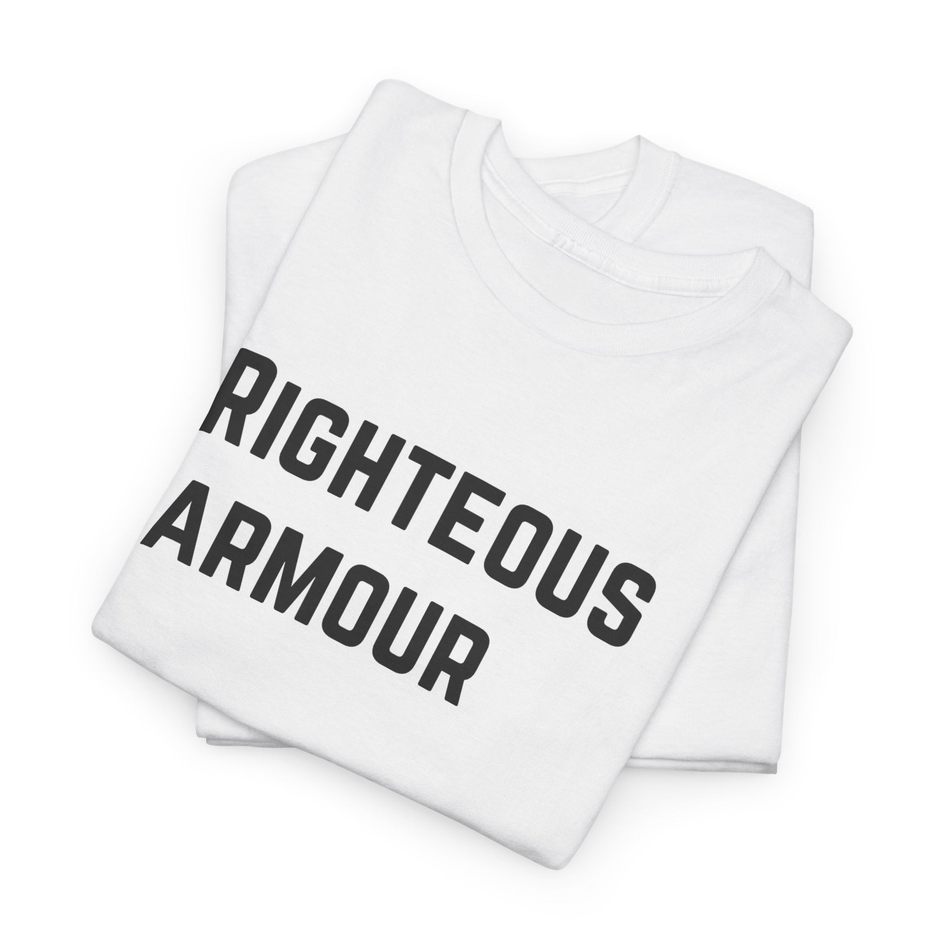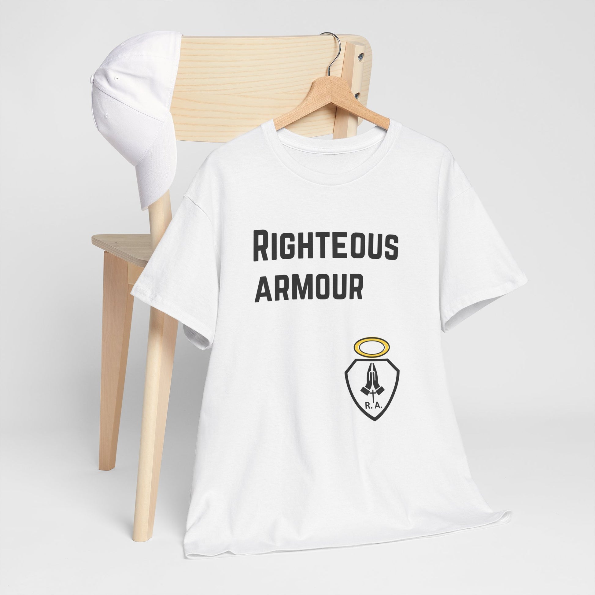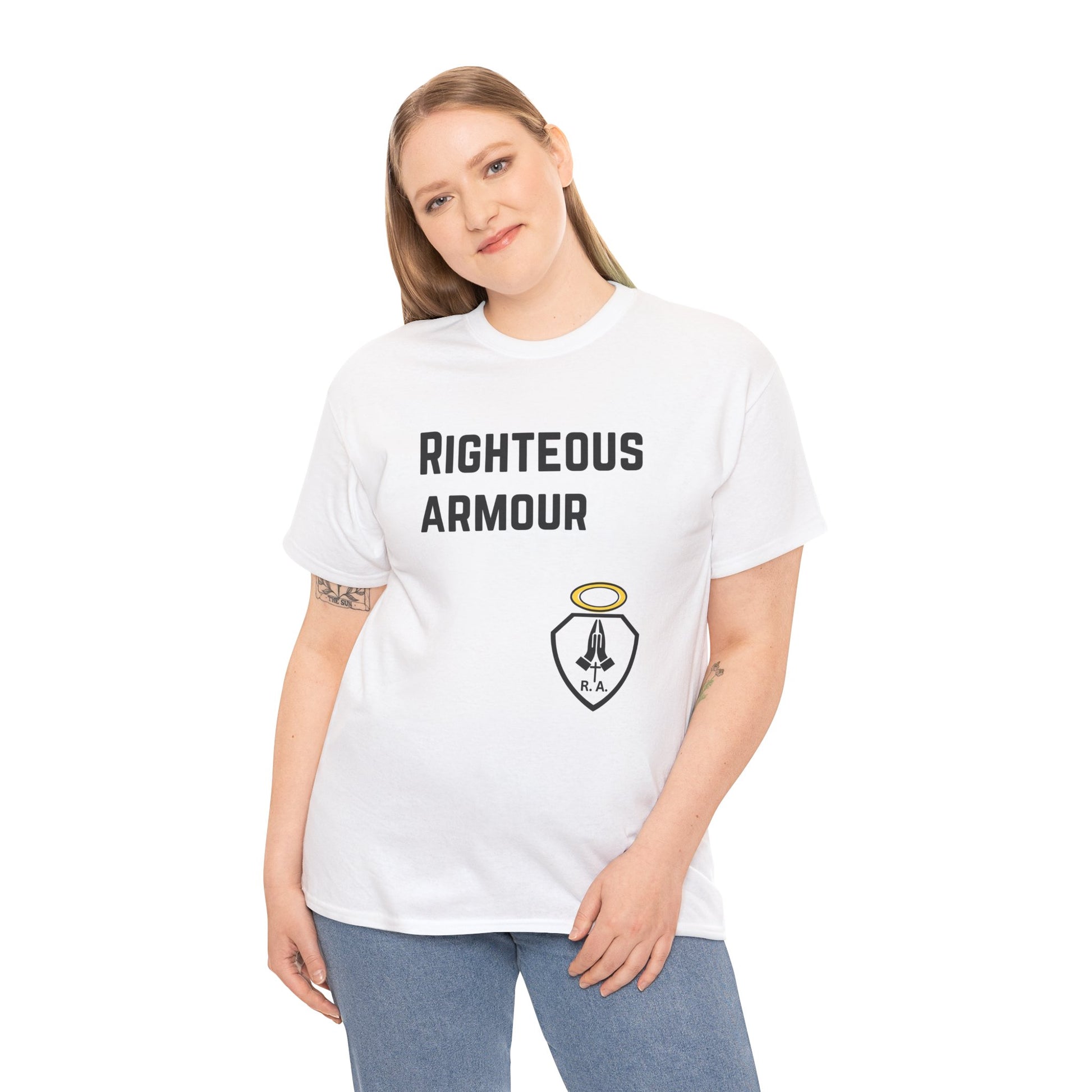 *RIGHTEOUS ARMOUR* is a great way to share your Love of God and show who you belong to. Start up a conversation about Jesus or just represent your part in the family of God. This unisex heavy cotton tee is the basic staple of any wardrobe. The specially spun fibers provide a smooth texture against your skin, guaranteeing you comfort. No side seams mean there are no itchy interruptions under the arms. The shoulders have tape for improved durability.